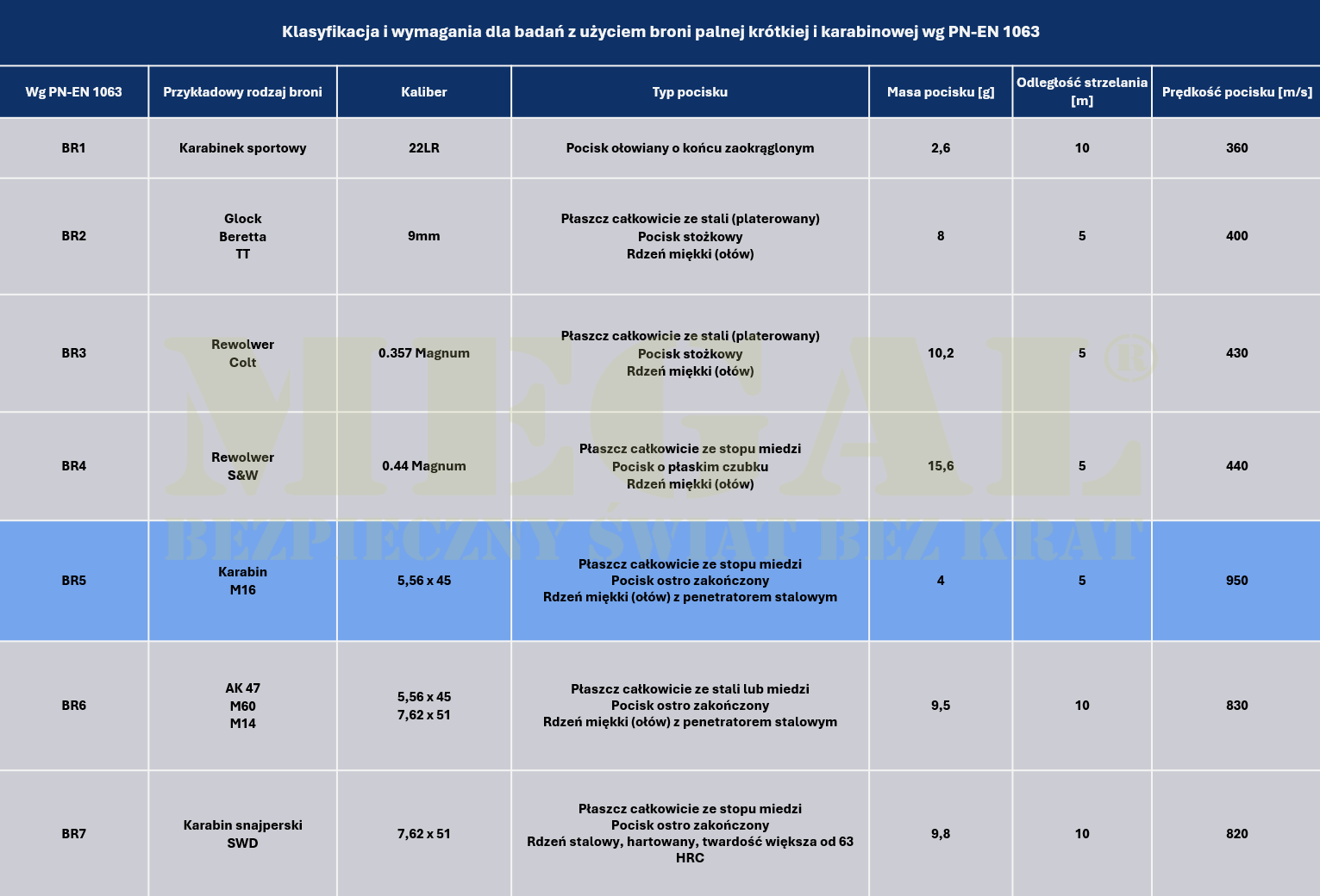 Klasyfikację określa norma PN-EN 1063:2002, zgodnie z którą do każdej wyprodukowanej szyby wydajemy certyfikat potwierdzający klasę wyrobu na podstawie otrzymanych atestów przez międzynarodowe jednostki certyfikujące. Szyby kuloodporne o specjalnym przeznaczeniu muszą w pierwszej kolejności chronić życie ludzkie lub wartości, które za nimi się znajdują, dlatego dokładność i jakość wykonywanych przez nas produktów potwierdzamy regularnymi badaniami.